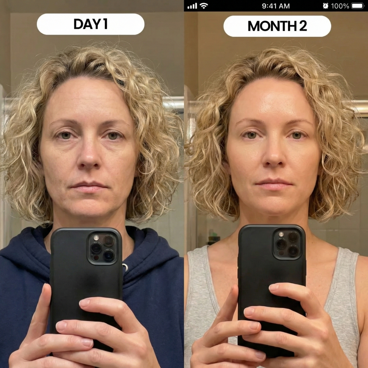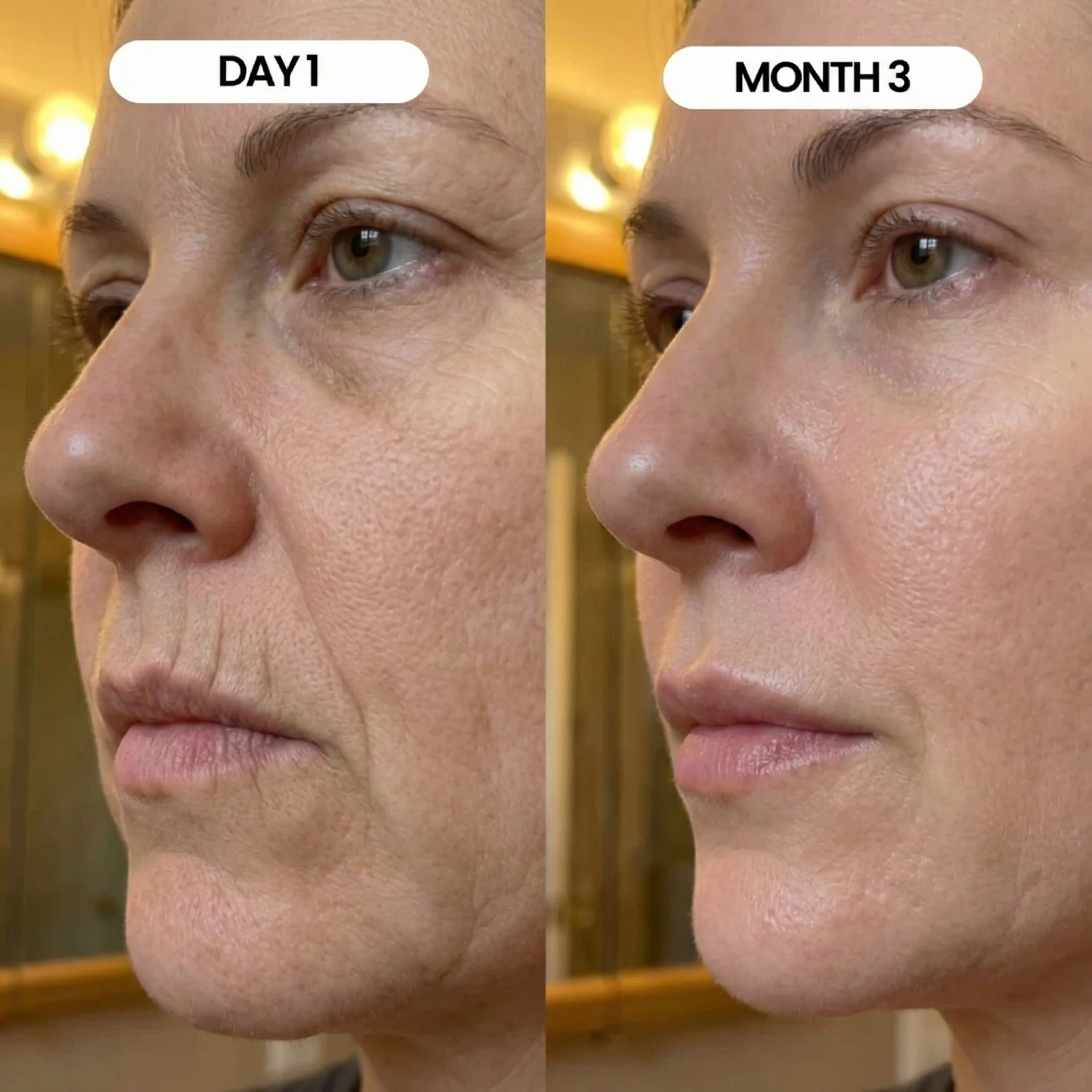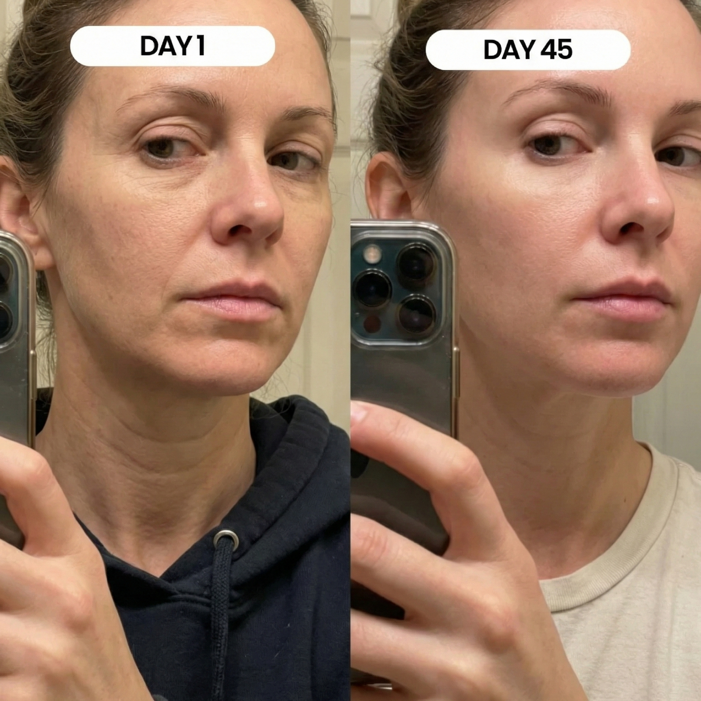 Early signs of smoother skin appear around the eyes and mouth. Makeup applies more evenly, with less settling into lines. The under-eye area looks more refreshed.