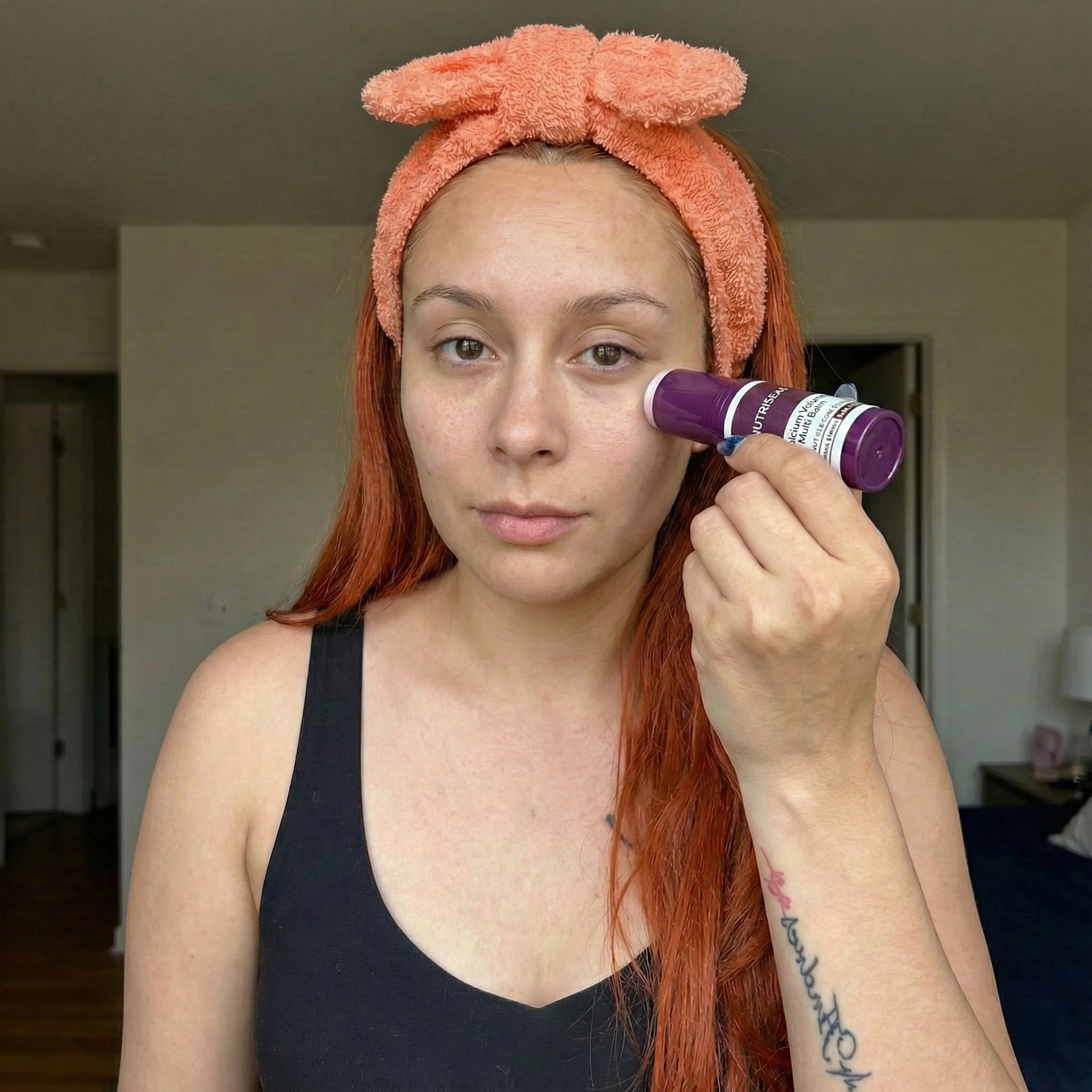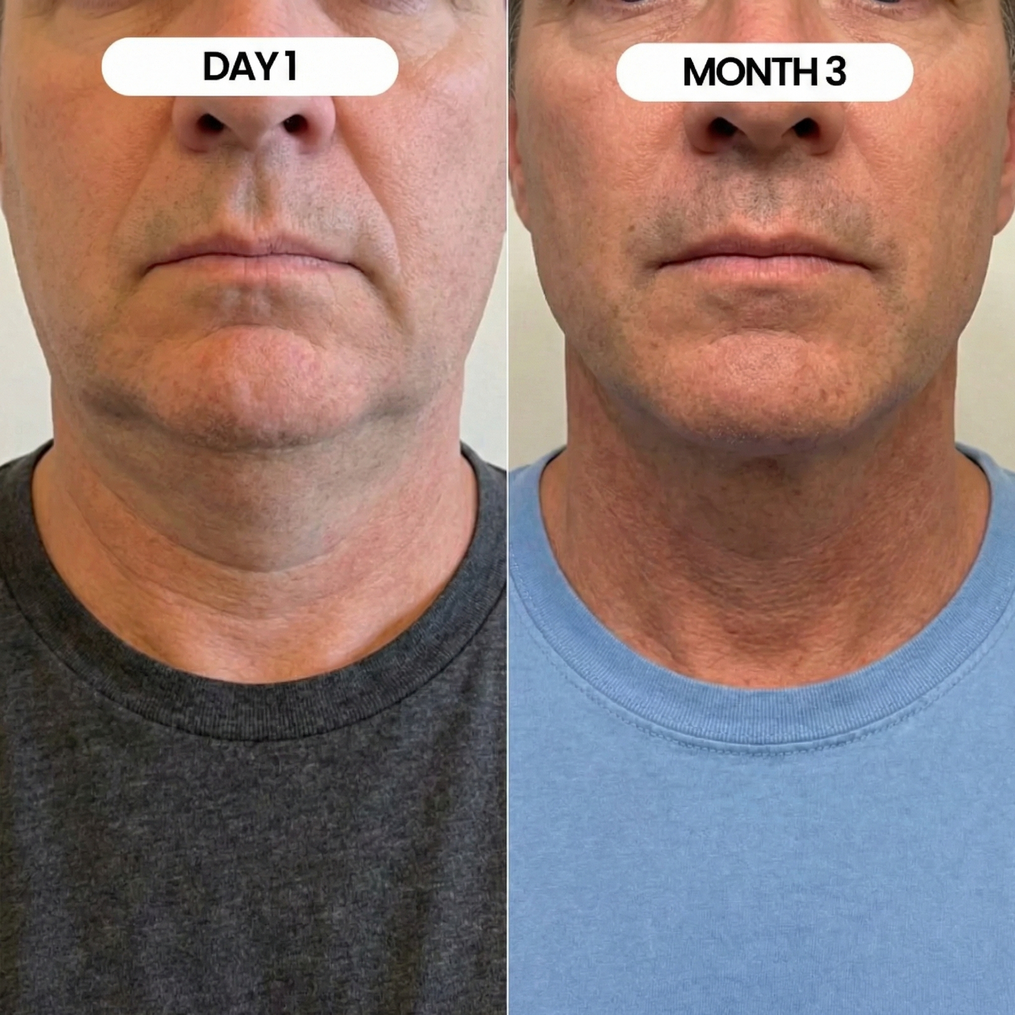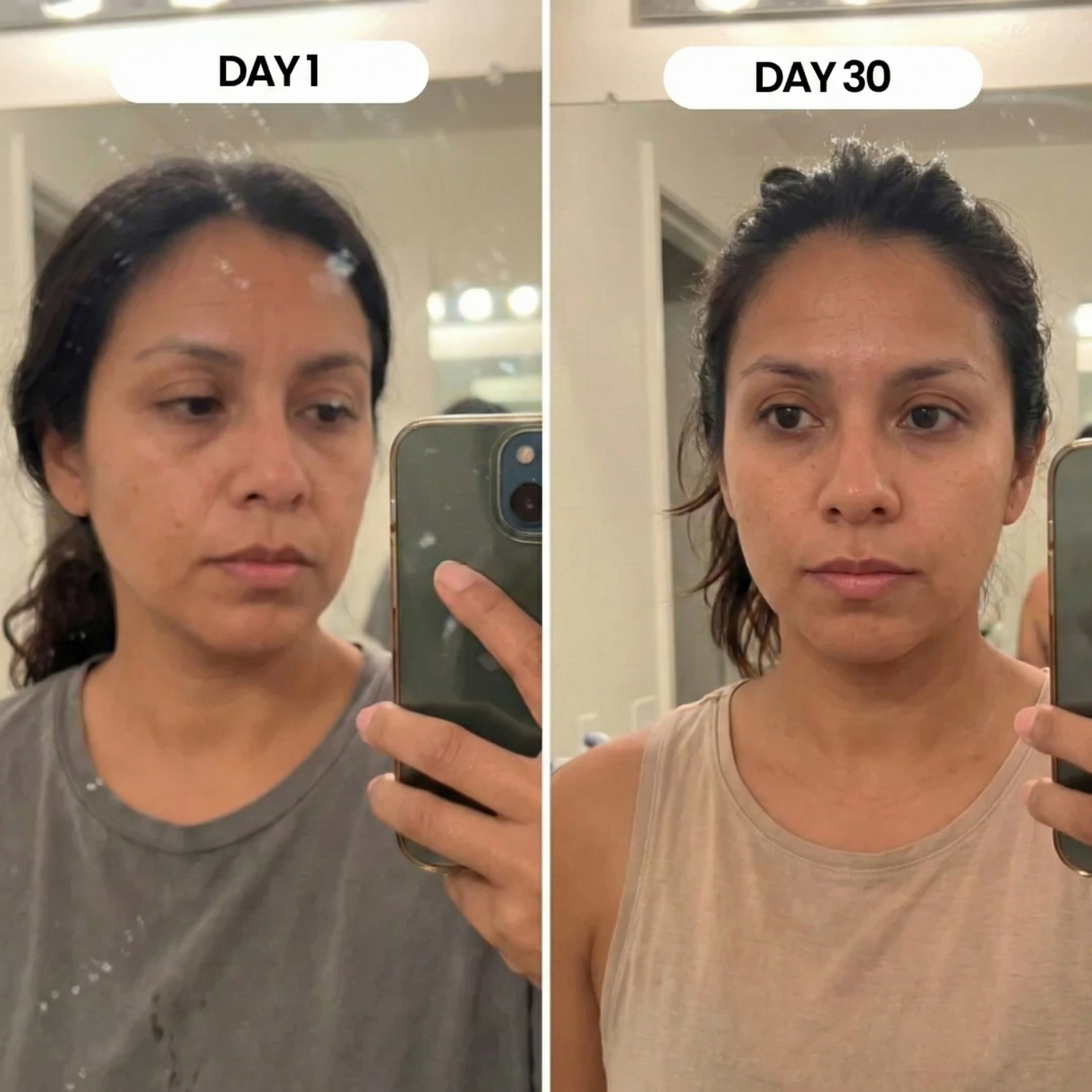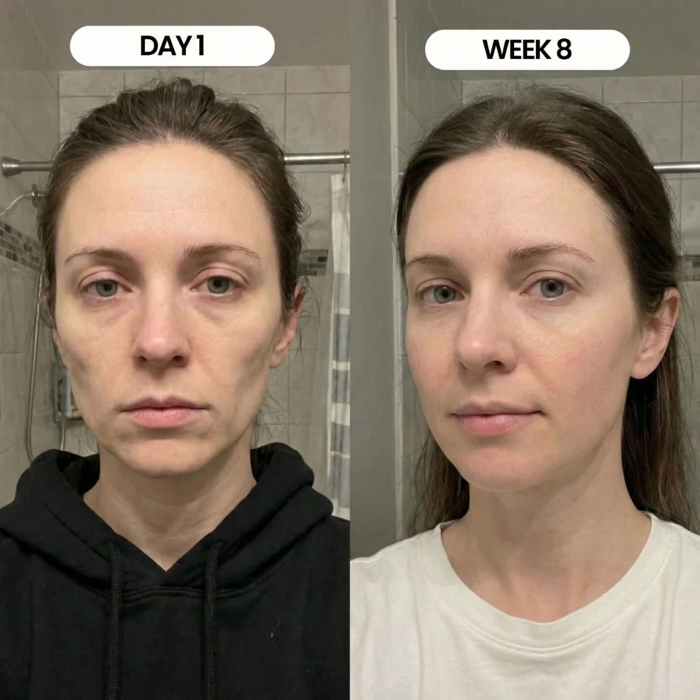 Early signs of smoother skin appear around the eyes and mouth. Makeup applies more evenly, with less settling into lines. The under-eye area looks more refreshed.